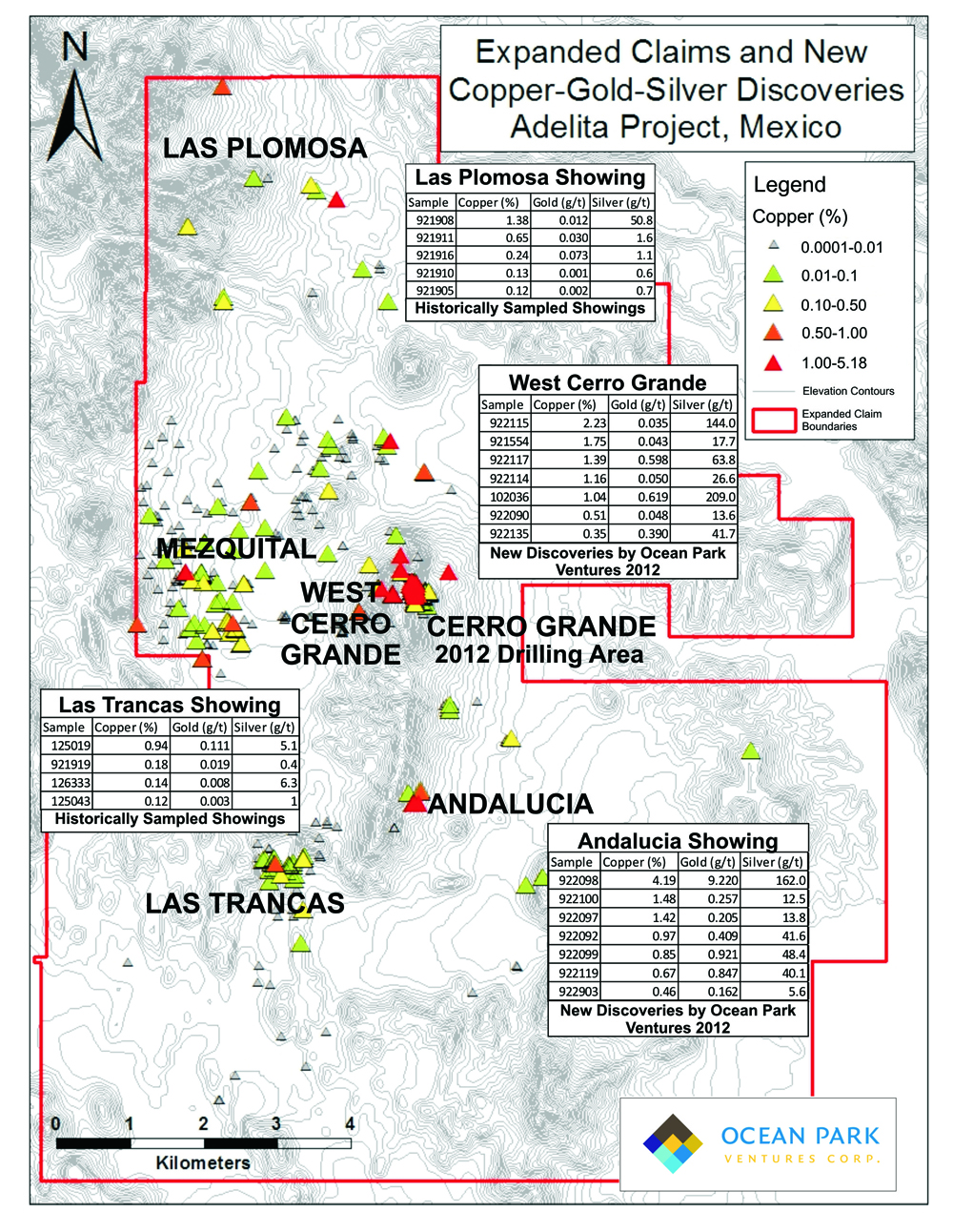 - Cerro Grande, where drill hole CGDD-12-009 returned 105.2 metres of 1.03% copper, 0.43 g/t gold and 36.3 g/t silver from a copper-gold-silver mineralized skarn with 800 metres of mapped surface strike and drill results indicating at least 300 metres of vertical depth (see Ocean Park news releases of May 3rd and May 30th, 2012).