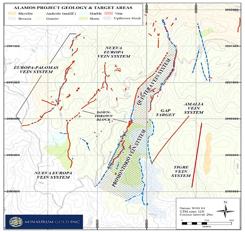 Minaurum Gold, Inc. ("Minaurum") is pleased to announce the commencement of a minimum 5,000-m diamond drill program at its Alamos Silver Project in Sonora, Mexico. The drilling will focus on seven major mineralized vein structures identified by Minaurum’s 2016-2017 sampling and mapping program. Three of these were the source of Alamos district’s historic 200 Moz high-grade silver production and may still contain overlooked silver shoots (See News Releases dated May 24, 2017 and March 16, 2017). The remaining veins lie in structurally down-dropped blocks and are exposed at a high level. Although they locally carry very high silver grades (>3000 g/t) none have seen significant production nor have they been drilled. Most of the drilling is also designed to cut completely blind veins that may exist at relatively shallow depths between the exposed veins. The target areas are shown on the accompanying map of the Alamos project area.