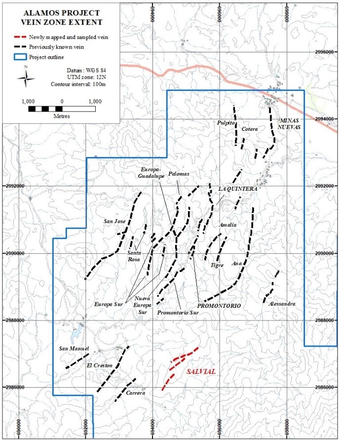 Figure 1. Alamos project, showing previously known vein zones and the newly mapped and sampled Salvial vein zone.