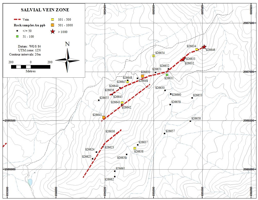 Figure 2. Salvial vein zone, showing rock sample locations, identified by sample number. Significant sample results are presented in Table 1. The Salvial zone is entirely hosted by quartz monzonite.