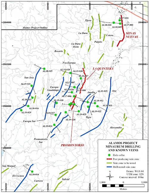 “Our systematic approach to determining the extent of the Alamos District continues to be validated by drilling silver mineralization in newly recognized veins outside of the historical mining areas. We now have high-grade silver intercepts in 10 of the 14 vein systems drilled to date,” stated Darrell Rader, President and CEO of Minaurum Gold. “We still have six more veins that need to be tested before we begin follow-up drilling that will target the veins that have the potential to host volumes of high-grade mineralization similar to that of the historic Quintera and Promontorio mines.”