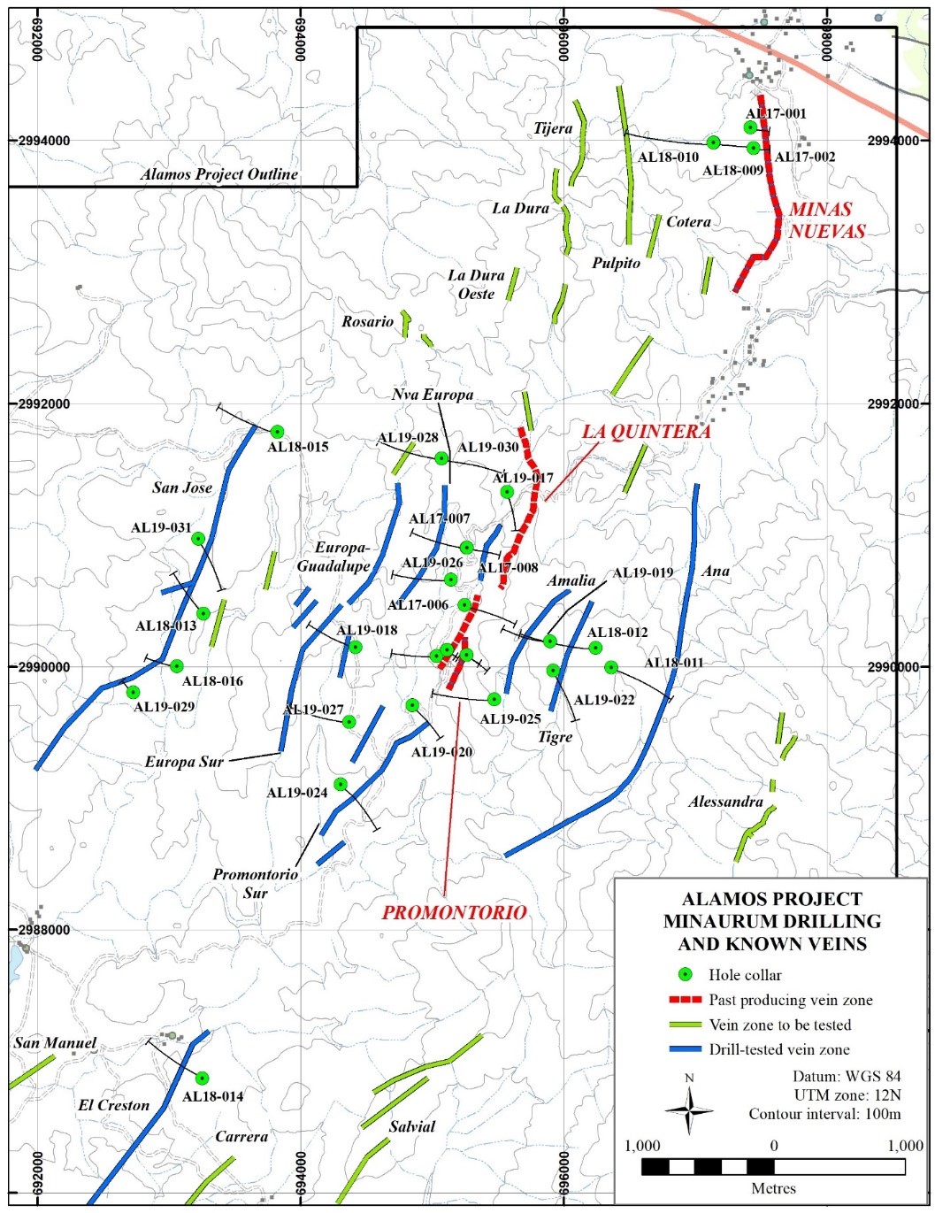 “Our systematic approach to determining the extent of the Alamos District continues to be validated by drilling silver mineralization in newly recognized veins outside of the historical mining areas. We now have high-grade silver intercepts in 10 of the 14 vein systems drilled to date,” stated Darrell Rader, President and CEO of Minaurum Gold. “We still have six more veins that need to be tested before we begin follow-up drilling that will target the veins that have the potential to host volumes of high-grade mineralization similar to that of the historic Quintera and Promontorio mines.”