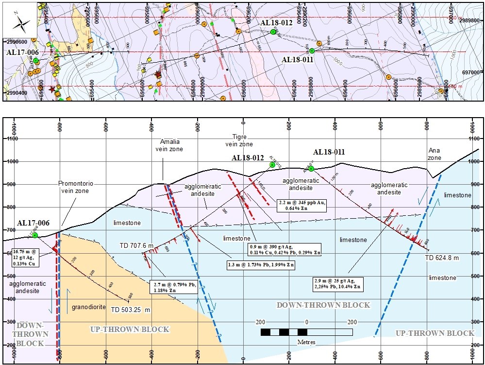 AL18-012 targeted the Tigre and Amalia vein zones, cutting first a blind vein from 123.15 to 124.20 m that averaged 666 ppb Au and 0.59% Zn before hitting a 0.90-m zone from 203.75 m to 204.65 m returning 390 g/t Ag, 0.42% Pb, and 0.29% Zn. AL18-012 also intersected a 1.30-m limestone/skarn-hosted interval, possibly the Amalia zone, from 466.45 m to 467.75 m that returned 1.73% Pb and 1.99% Zn.