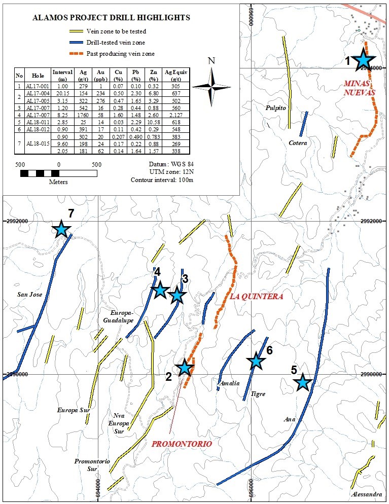 “We’re excited that drilling continues to cut significant silver and base-metal mineralization throughout the Alamos project. Our focus remains on aggressively stepping-out from the known areas and determining how many of our newly discovered veins have the potential to host mineralization similar to that produced historically from the Quintera-Promontorio vein system” stated Darrell Rader, President and CEO of Minaurum Gold. “As we know from the historic workings, high-grade deposits occur in shoots on veins that pinch and swell. By the second half of 2019, we will have drilled most of the new veins discovered thus far. At that point, we will allocate meterage for follow-up drilling on the veins where we’ve hit strong mineralization.”
