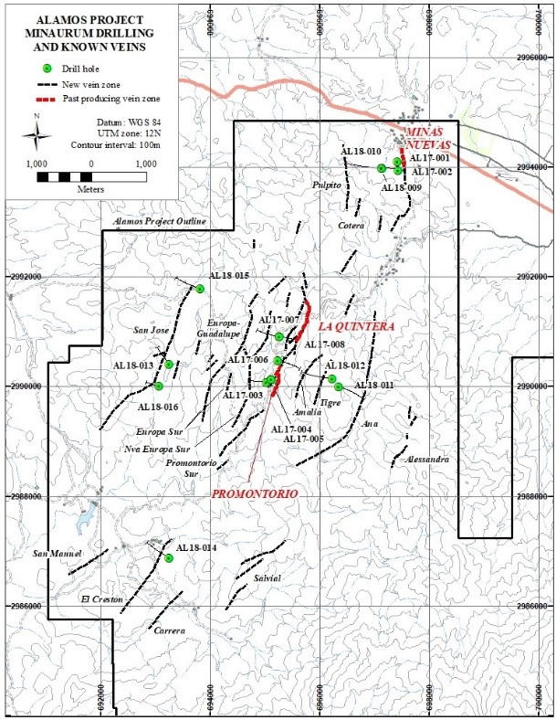To date, Minaurum has drilled portions of 9 of the 15 vein systems identified at Alamos. The near-term exploration strategy remains focused on a first-pass test of new vein systems lying outside of the historically producing mines of Minas Nuevas, La Quintera, and Promontorio. Minaurum plans to put at least one hole into each of the veins identified. Upon completion of systematic project-wide testing, follow-up drilling (Phase III) will be prioritized based on drill and sampling results along with favourable geologic indicators.