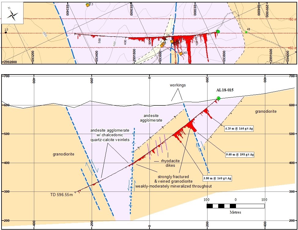 - 9.6 m of 198 g/t Ag, 0.17% Cu, 0.22% Pb, 0.88% Zn or 269 g/t Ag Equivalent (“AgEq”) in Hole AL18-015