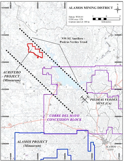 Figure 1. Alamos mining district, showing location of Aurífero project (red outline) in relation to Minaurum’s Alamos project (blue outline) and Cobre del Mayo’s Piedras Verdes porphyry copper mine (purple outline).
