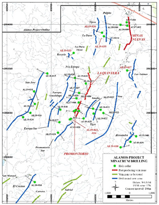 Figure 1. Alamos project, showing known vein zones and Minaurum drilling to date in Phase I and Phase 2. Assay for drill holes labelled in red are reported in this press release. Assays are pending for completed holes AL19-039 and AL19-040. Please click on map image to view in full size.