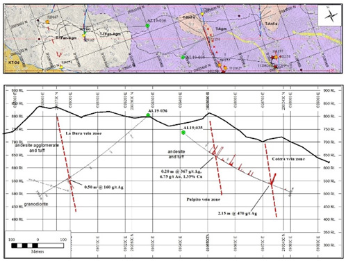 Minaurum tested both Púlpito and Cotera veins with a single hole, AL19-035 (Figures 1 and 2). The hole cut several zones of mineralization, including 7.60 m of vein breccia from 392.10 to 399.70 m that averaged 155 g/t Ag, about 150 m below the surface expression of Cotera. Within that interval a 2.15-m section ran 470 g/t Ag. A 20-cm wide sample within a blind sulfide-bearing quartz vein at Púlpito at a depth of 159.70 m assayed 367 g/t Ag, 6.75 g/t Au, 1.35% Cu, 0.59% Pb, and 0.56% Zn.