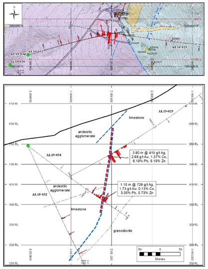 - 1.10 m of 729 g/t Ag, 1.73 g/t Au, and 8.91% Cu-Pb-Zn (Hole AL19-034)