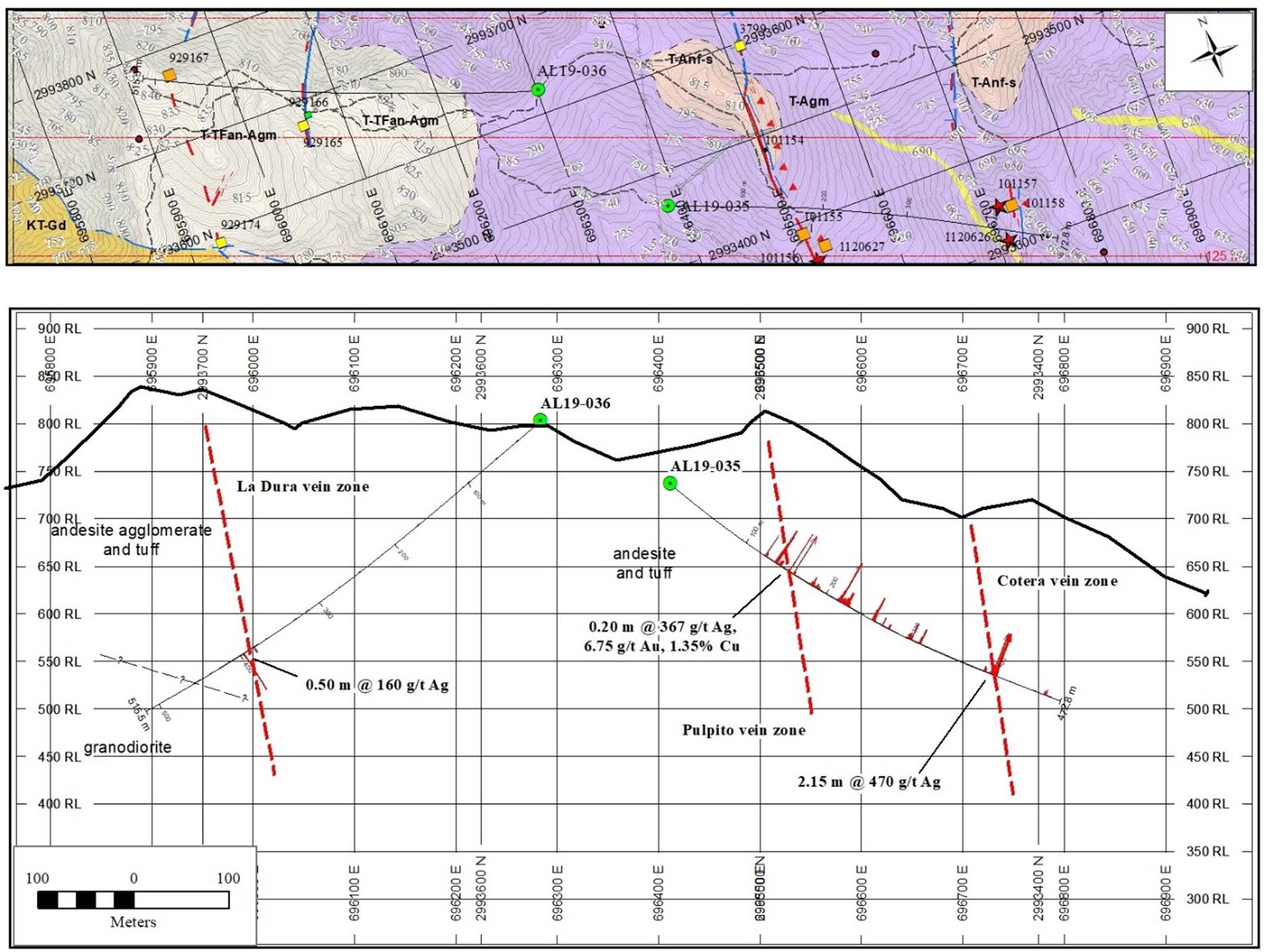 Figure 2. Cross section of holes AL19-035 and AL19-036, Cotera-Púlpito and Tijera-La Dura vein zones.