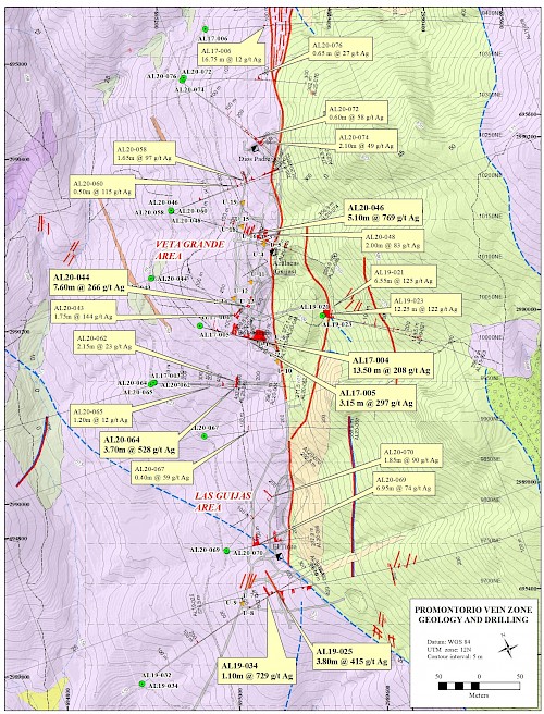 Table 1. Promontorio vein zone assay highlights of holes AL20-58, AL20-060, AL20-062, AL20-064, AL20-065, AL20-067, AL20-069, AL20-070, AL20-072, AL20-074, and AL20-076. See Figures 2 and 3 for hole and intercept locations. Hole depths in metres. True thicknesses of the intersections in Table 1 are estimated as 60-80% of drilled thicknesses.