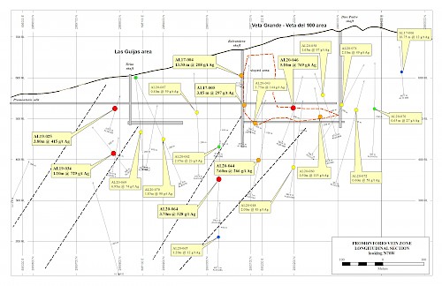 The Las Guijas section of the Promontorio zone refers to a split off the main Promontorio vein/fault zone. Holes AL20-069 and AL20-070 followed up on holes AL19-025 and AL19-034 (see New Release dated August 22nd, 2019), drilling the Las Guijas zone about 75 and 125 m north, respectively. AL20-069 drilled 2 intervals of significant mineralization, including 1.0 m @ 327 g/t Ag, 0.97 g/t Au, and 9.5% combined base metals; and 0.45 m @ 403 g/t Ag, 1.89 g/t Au, and 22% combined base metals. AL20-070 cut the Las Guijas vein split at an oblique angle and encountered three weakly mineralized veins. The intercept in AL19-034 (1.1 m @ 729 g/t Ag) lies about 100 m below the AL19-025 and 50 m below the AL20-069 intercepts, suggesting a potential SW-plunging shoot, as shown in Figure 3. The potential shoot may be controlled in part by a NW-SE trending shoot that cuts the Promontorio zone.
