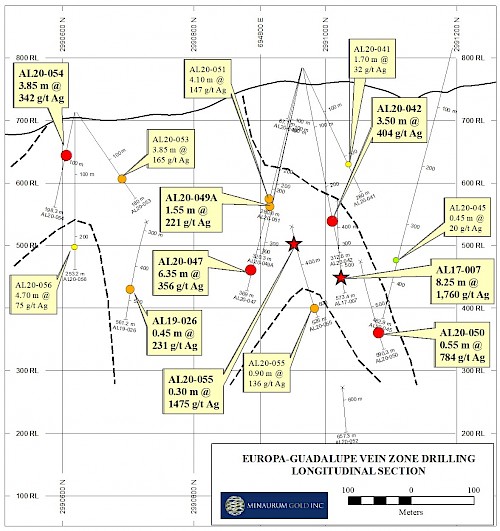 Three holes were aimed to intersect the Europa-Guadalupe zone down-dip from the AL07-007 intercept (see News Release dated January 18th, 2018). Hole AL20-050 cut the vein zone about 100 m down dip and 40 m to the north of -007. The vein was faulted but returned 0.55 m @ 784 g/t Ag. Hole -052 aimed to intersect the projection of the Europa-Guadalupe zone about 200 m down-dip from the -007 intercept; it cut a previously unknown granodiorite which had a 25 m-wide quartz-chlorite alteration zone at the predicted vein depth. Hole -055 targeted the vein zone about 60 south and 60 m down-dip of the -007 intercept and cut 21.20 m of variably mineralized vein averaging 35 g/t Ag. The best sub-interval reported 0.90 m @ 136 g/t Ag and 0.95 m @ 105 g/t Ag.