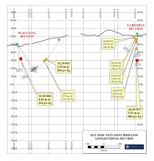 The northernmost part of the San José vein zone, the La Huerta section, was first tested by Minaurum with hole AL18-015, which returned 9.6 m of 198 g/t Ag, 0.9 m of 302 g/t Ag, and 2.05 m of 181 g/t Ag from separate intervals (see News Release dated March 1st, 2019). Two holes were drilled to offset the -015 intersections. Hole AL20-073 was drilled from the same collar, but aimed to the southwest. It intersected 3.05 m @ 168 g/t, including 0.60 m @ 645 g/t Ag. Hole AL20-075, drilled from the same collar as -015 and -073, but below -015. It cut broad zones of moderate mineralization, punctuated by 8.90 m @ 143 g/t Ag, which includes 0.80 m @ 350 g/t and 2.15 m @ 460 g/t Ag. Mineralization is open at depth and along strike.