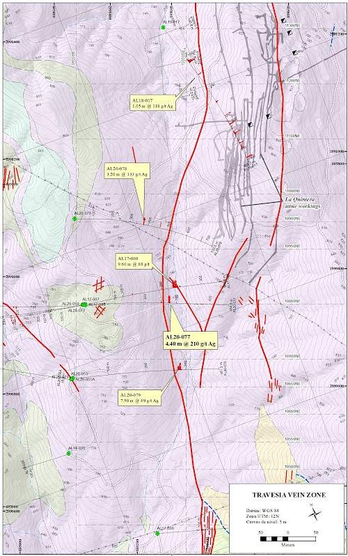 Hole AL20-077 intersected the Travesía zone roughly 100 m below the AL17-008 intersection. It cut 4.40 m @ 210 g/t Ag and 3.17% combined base metals, andesitic pyroclastic rocks in the hanging wall and intrusive rocks in holes AL17-008 and AL20-077. AL20-078 cut the Travesía zone about 150 m north of the AL17-008 – AL20-077 section and intersected 1.0 m @ 81 g/t Ag. Hole AL20-079 drilled the Travesía zone approximately 100 m south of the -077 intersection. It cut a 7.50-m mineralized interval averaging 69 g/t Ag and 0.29% Cu that includes 0.90 m of 148 g/t Ag and 0.43% Cu.