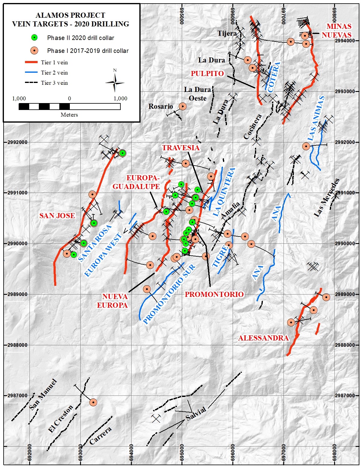 Figure 1. Phase II prioritized vein zone targets and Phase I and Phase II drilling at the Alamos project. Please click on image to view in full size.