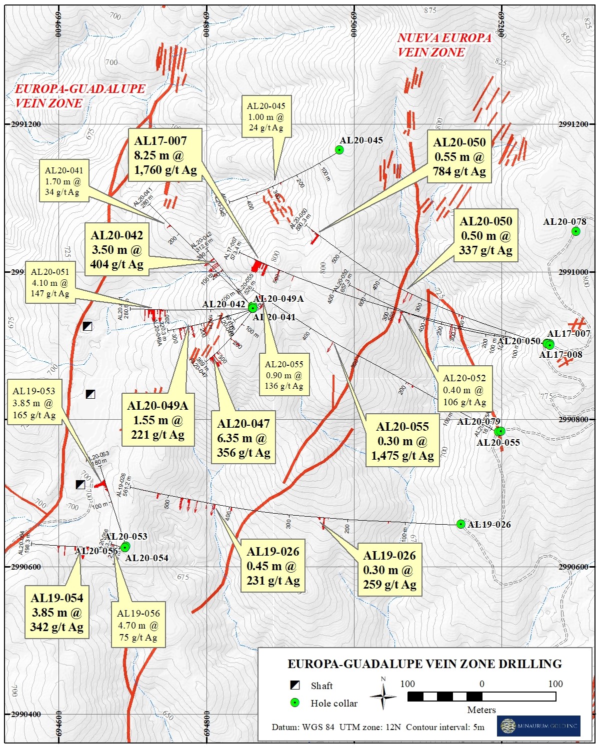 Three holes were aimed to intersect the Europa-Guadalupe zone down-dip from the AL07-007 intercept (see News Release dated January 18th, 2018). Hole AL20-050 cut the vein zone about 100 m down dip and 40 m to the north of -007. The vein was faulted but returned 0.55 m @ 784 g/t Ag. Hole -052 aimed to intersect the projection of the Europa-Guadalupe zone about 200 m down-dip from the -007 intercept; it cut a previously unknown granodiorite which had a 25 m-wide quartz-chlorite alteration zone at the predicted vein depth. Hole -055 targeted the vein zone about 60 south and 60 m down-dip of the -007 intercept and cut 21.20 m of variably mineralized vein averaging 35 g/t Ag. The best sub-interval reported 0.90 m @ 136 g/t Ag and 0.95 m @ 105 g/t Ag.