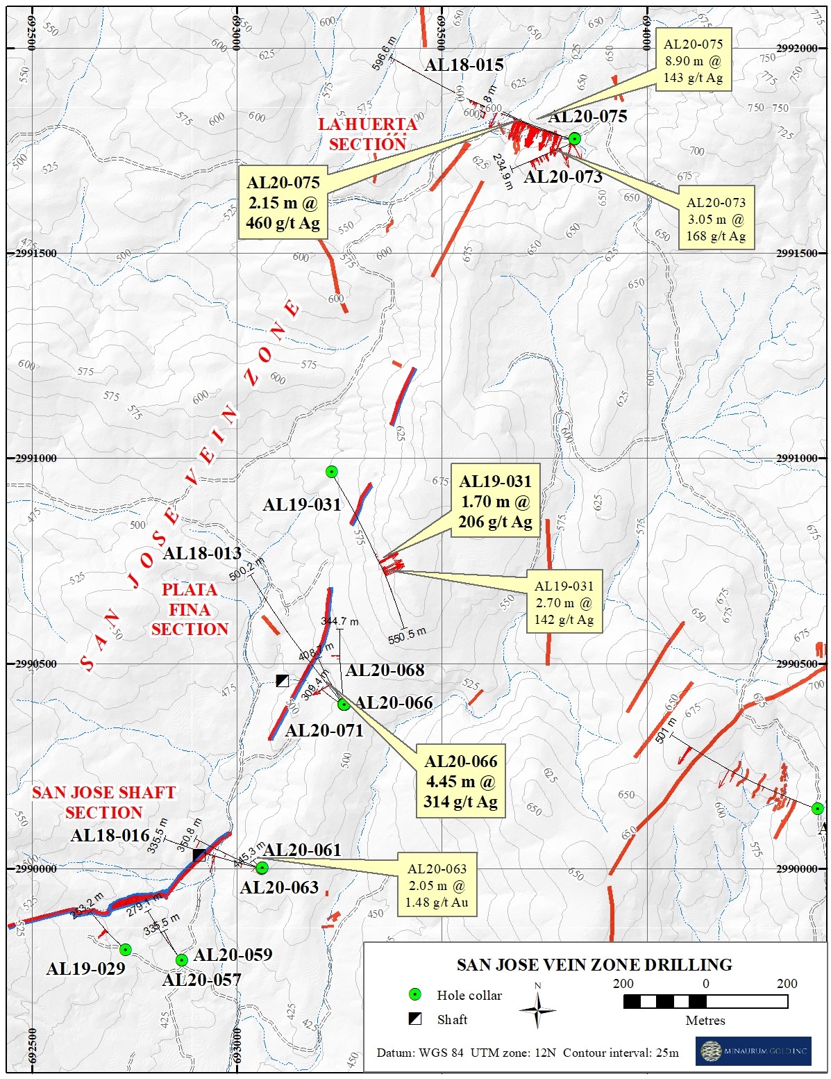 The northernmost part of the San José vein zone, the La Huerta section, was first tested by Minaurum with hole AL18-015, which returned 9.6 m of 198 g/t Ag, 0.9 m of 302 g/t Ag, and 2.05 m of 181 g/t Ag from separate intervals (see News Release dated March 1st, 2019). Two holes were drilled to offset the -015 intersections. Hole AL20-073 was drilled from the same collar, but aimed to the southwest. It intersected 3.05 m @ 168 g/t, including 0.60 m @ 645 g/t Ag. Hole AL20-075, drilled from the same collar as -015 and -073, but below -015. It cut broad zones of moderate mineralization, punctuated by 8.90 m @ 143 g/t Ag, which includes 0.80 m @ 350 g/t and 2.15 m @ 460 g/t Ag. Mineralization is open at depth and along strike.