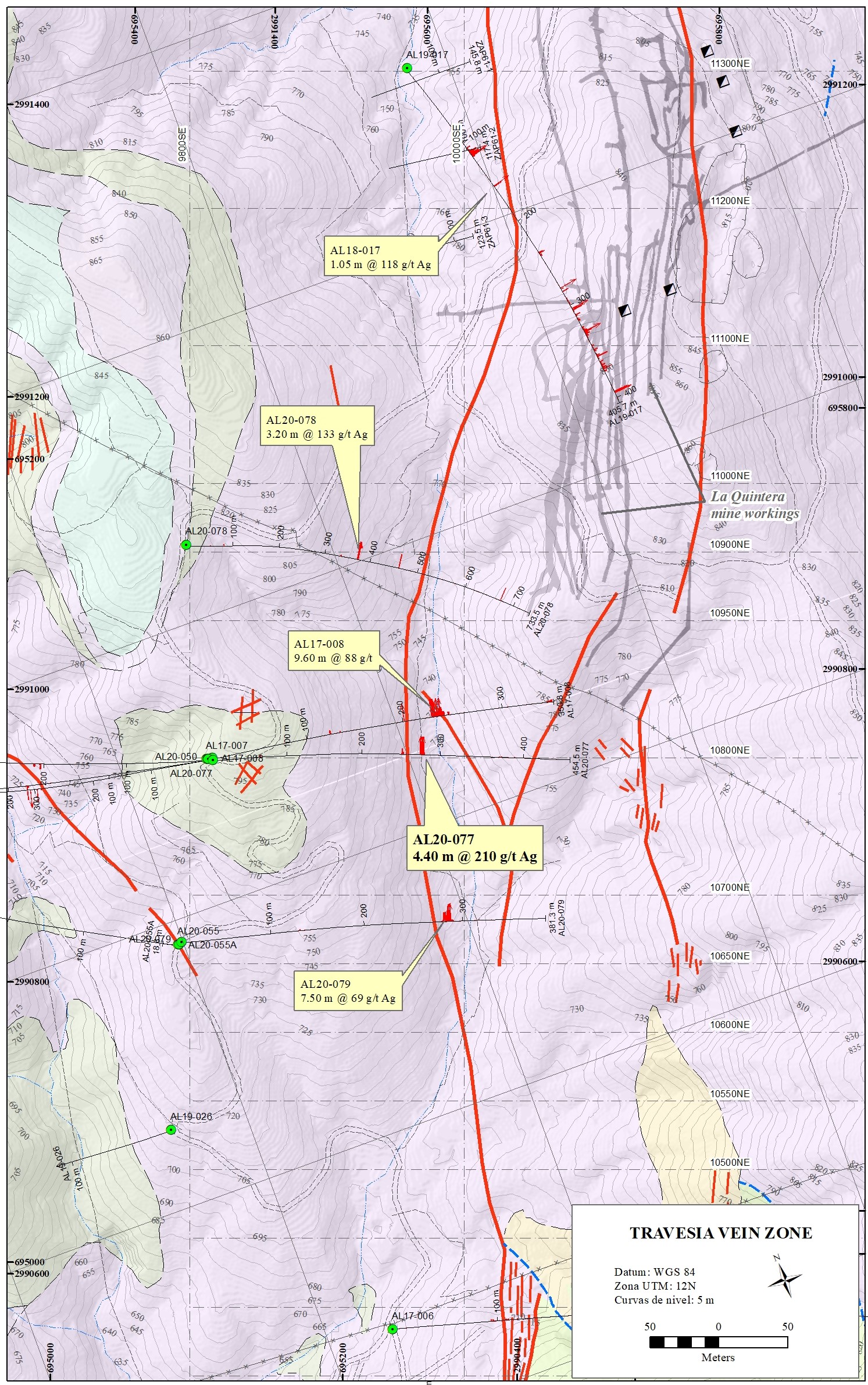 Hole AL20-077 intersected the Travesía zone roughly 100 m below the AL17-008 intersection. It cut 4.40 m @ 210 g/t Ag and 3.17% combined base metals, andesitic pyroclastic rocks in the hanging wall and intrusive rocks in holes AL17-008 and AL20-077. AL20-078 cut the Travesía zone about 150 m north of the AL17-008 – AL20-077 section and intersected 1.0 m @ 81 g/t Ag. Hole AL20-079 drilled the Travesía zone approximately 100 m south of the -077 intersection. It cut a 7.50-m mineralized interval averaging 69 g/t Ag and 0.29% Cu that includes 0.90 m of 148 g/t Ag and 0.43% Cu.