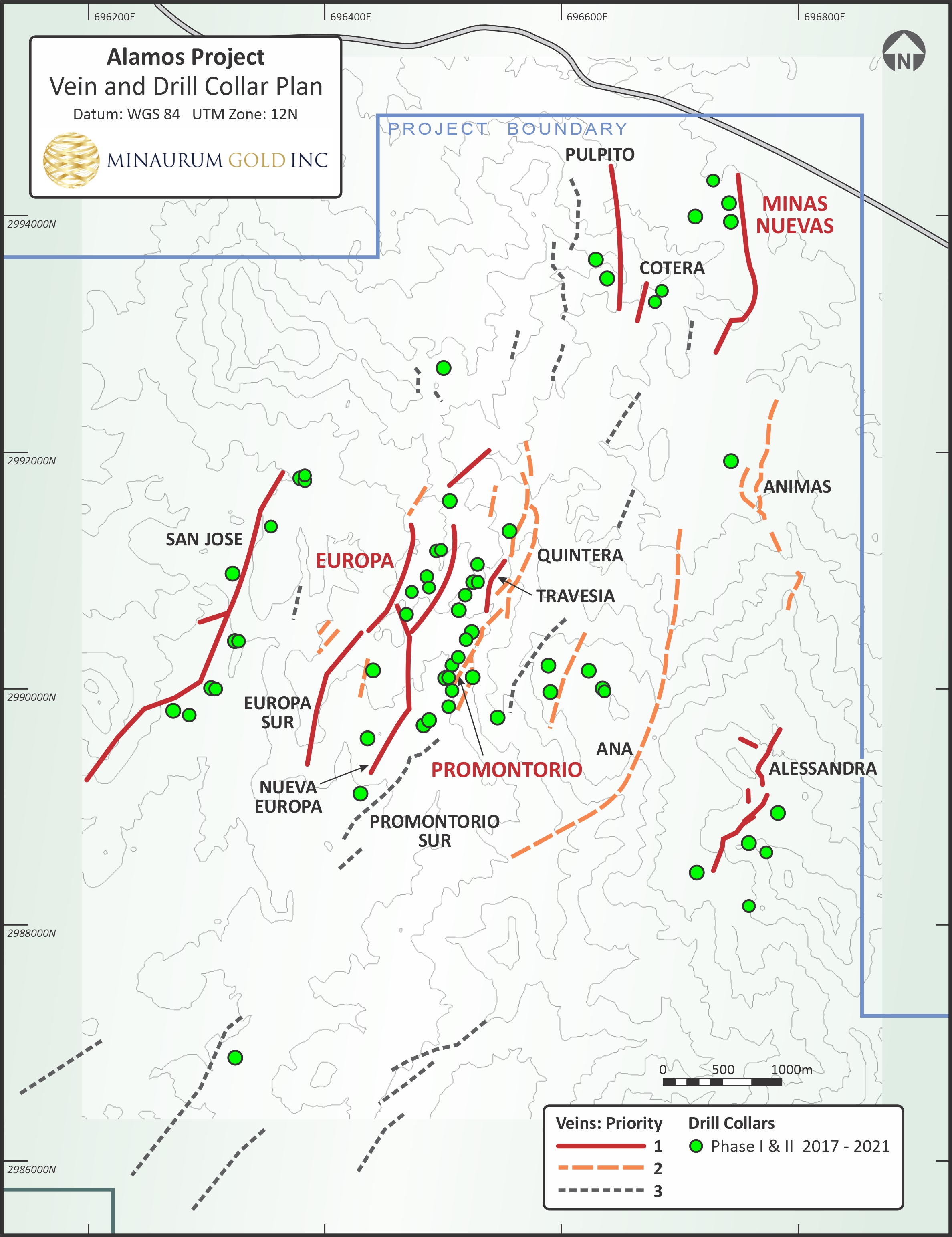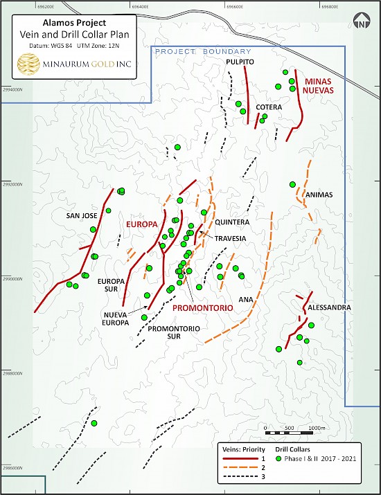 Figure 1. Vein-zone map of the Alamos project showing Minaurum drill-collar locations.