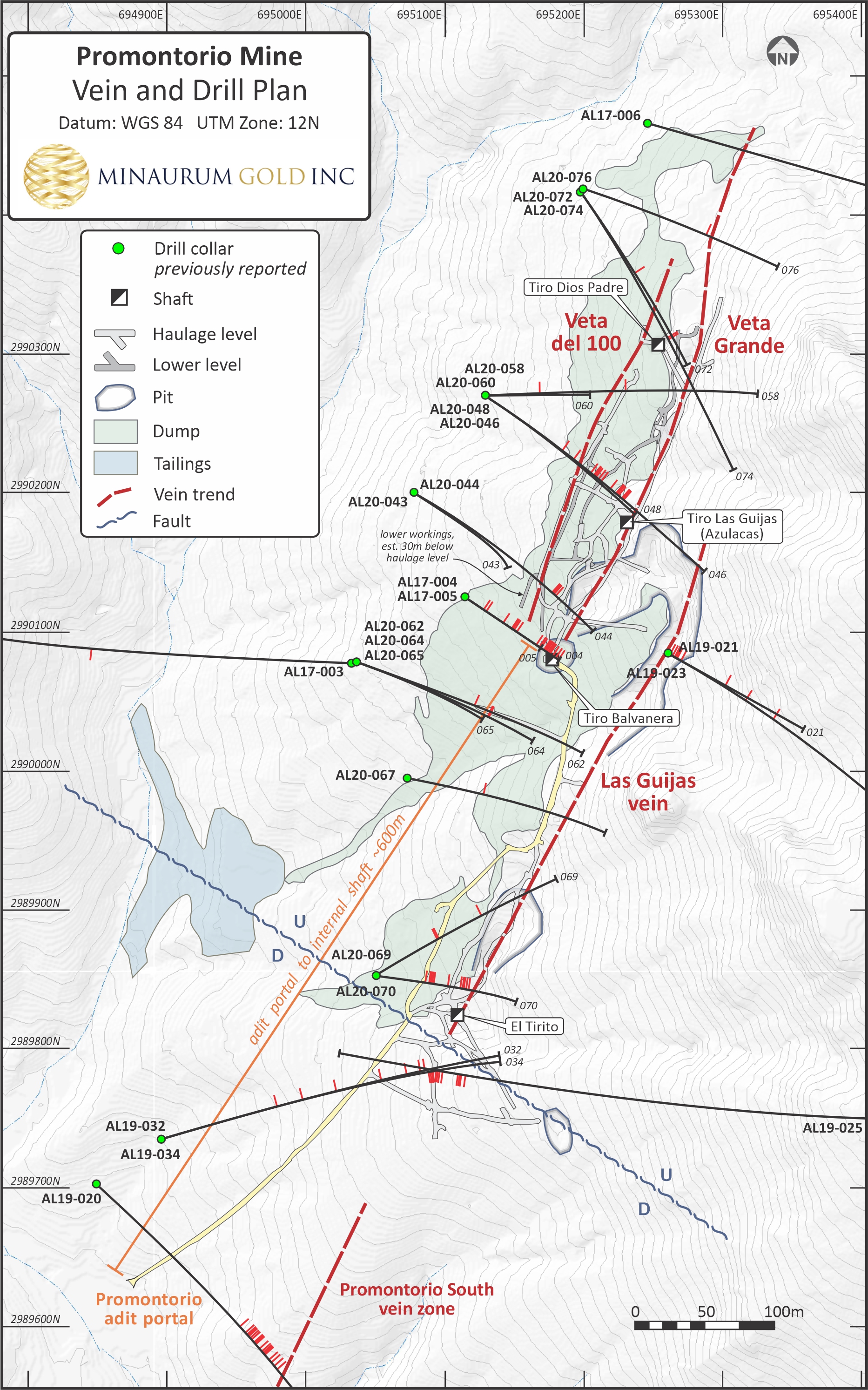 Historical records indicate that the Promontorio Mine closed in 1896 and remained abandoned until the 1960s. Material was processed from surface dumps and underground backfill, along with underground drilling and mapping at Promontorio. The 1960s effort included the clearing of the main haulage level and access to lower levels of the Promontorio Mine and to the northernmost part of it. Nineteen underground diamond holes were drilled during the 1960s and several of them intersected significant widths of high-grade mineralization (see Minaurum Historical Data news release dated February 6, 2020). This mineralization was left untouched and Minaurum successfully cut extensions of it with surface drilling.