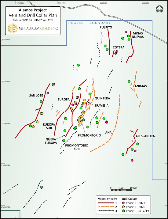 Minaurum Gold, Inc (“Minaurum”) (TSXV:MGG) (OTCQX:MMRGF) is pleased to announce it has returned high-grade silver intercepts from the final Phase II holes drilled in 2021 at its flagship Alamos silver project in Sonora, Mexico. In 2021, Minaurum drilled 9,386.50 m in 22 holes focusing on sizable step-outs at the Ana, Europa, San José, Alessandra, Cotera, and Minas Nuevas vein zones. The best results obtained in the Minas Nuevas, Cotera and San Jose vein zones are as follows.