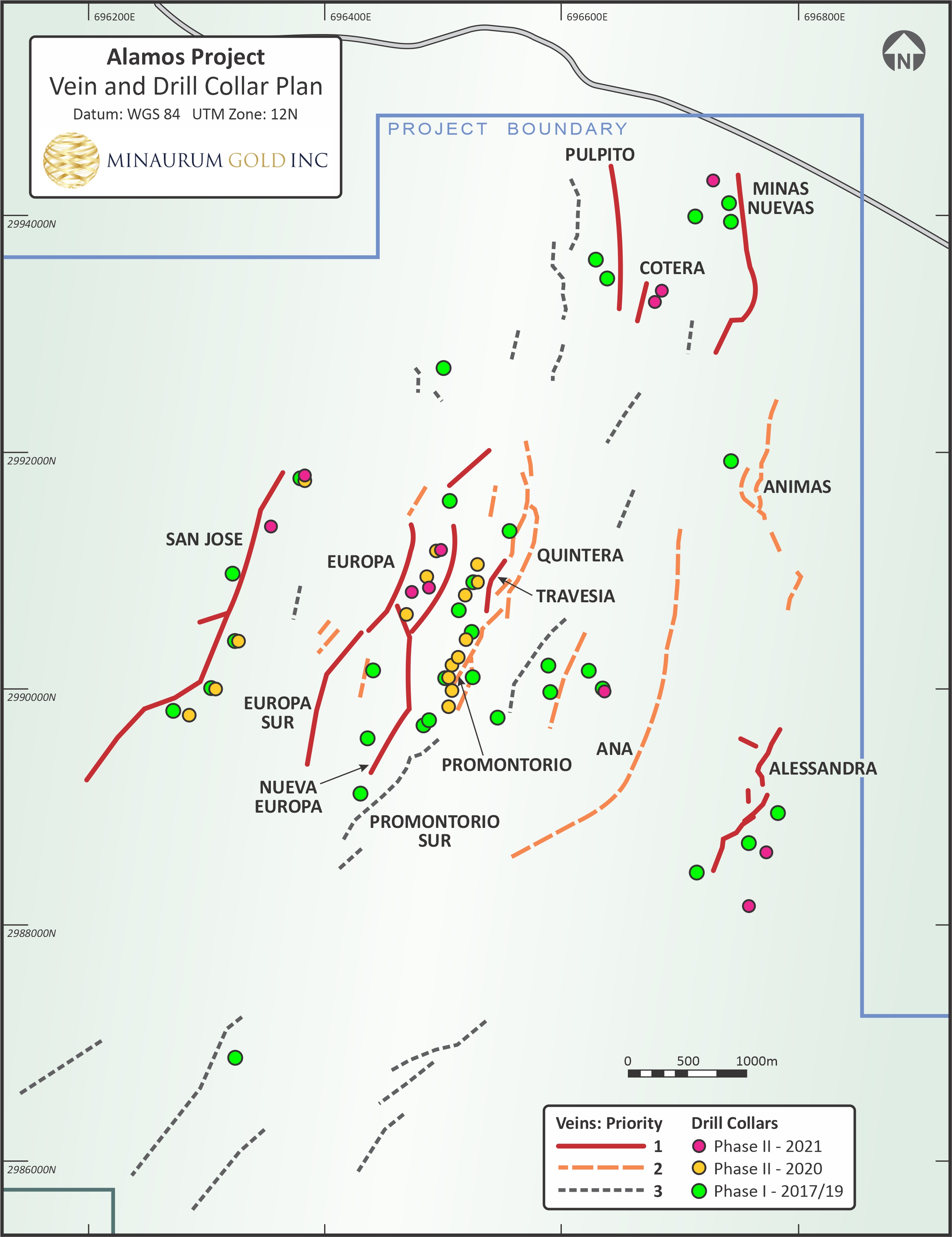 “Our Phase II drill program of aggressive step-outs has yielded high-grade silver results at the Cotera, Minas Nuevas and San José veins, significantly expanding the known mineralized footprint of each target” stated Darrell Rader, Minaurum President and CEO. “We are now planning to transition to more closely-spaced drilling as we advance the Alamos project. We will be providing an update shortly on our plans for 2022.”