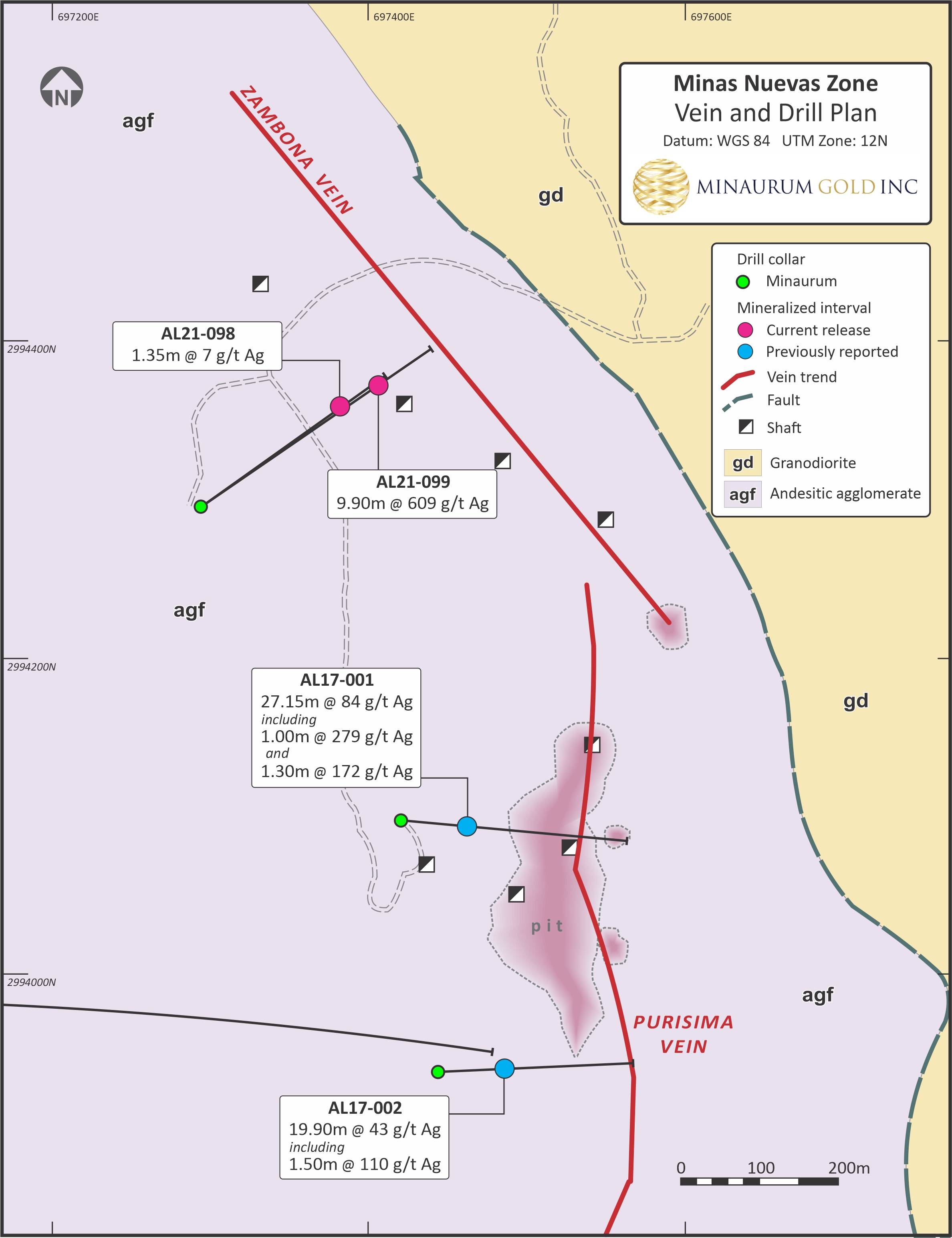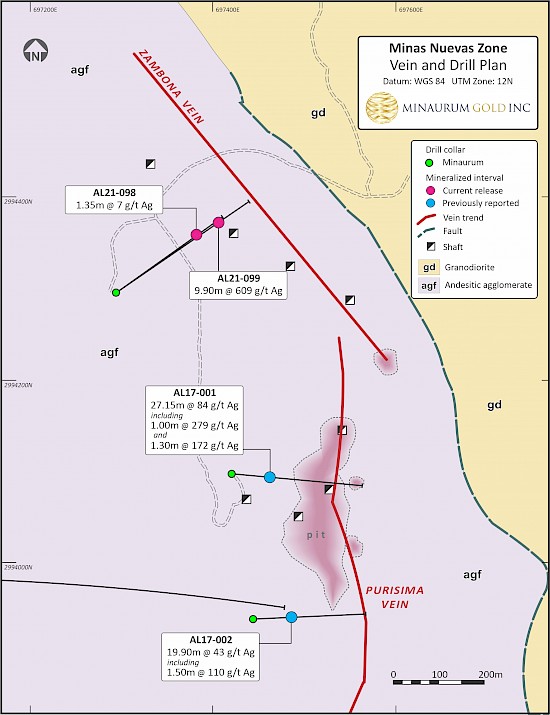 Hole AL21-099 intersected strong silver mineralization of 609 g/t Ag over 9.90 m, including 0.90 m @ 1,145 g/t Ag, 0.50 m @ 2,260 g/t Ag, and 0.50 m @ 2,360 g/t Ag, intersecting the shoot near the NW-most extent of the workings, leaving prospective ground further to the northwest along strike and down-plunge. Hole AL21-098 intersected several metres of quartz-carbonate veining with trace silver mineralization in the hanging wall of the fault contact with granodiorite, and appears to have been drilled underneath the silver shoot. Highlights of Minas Nuevas vein zone drilling are shown in Table 1.