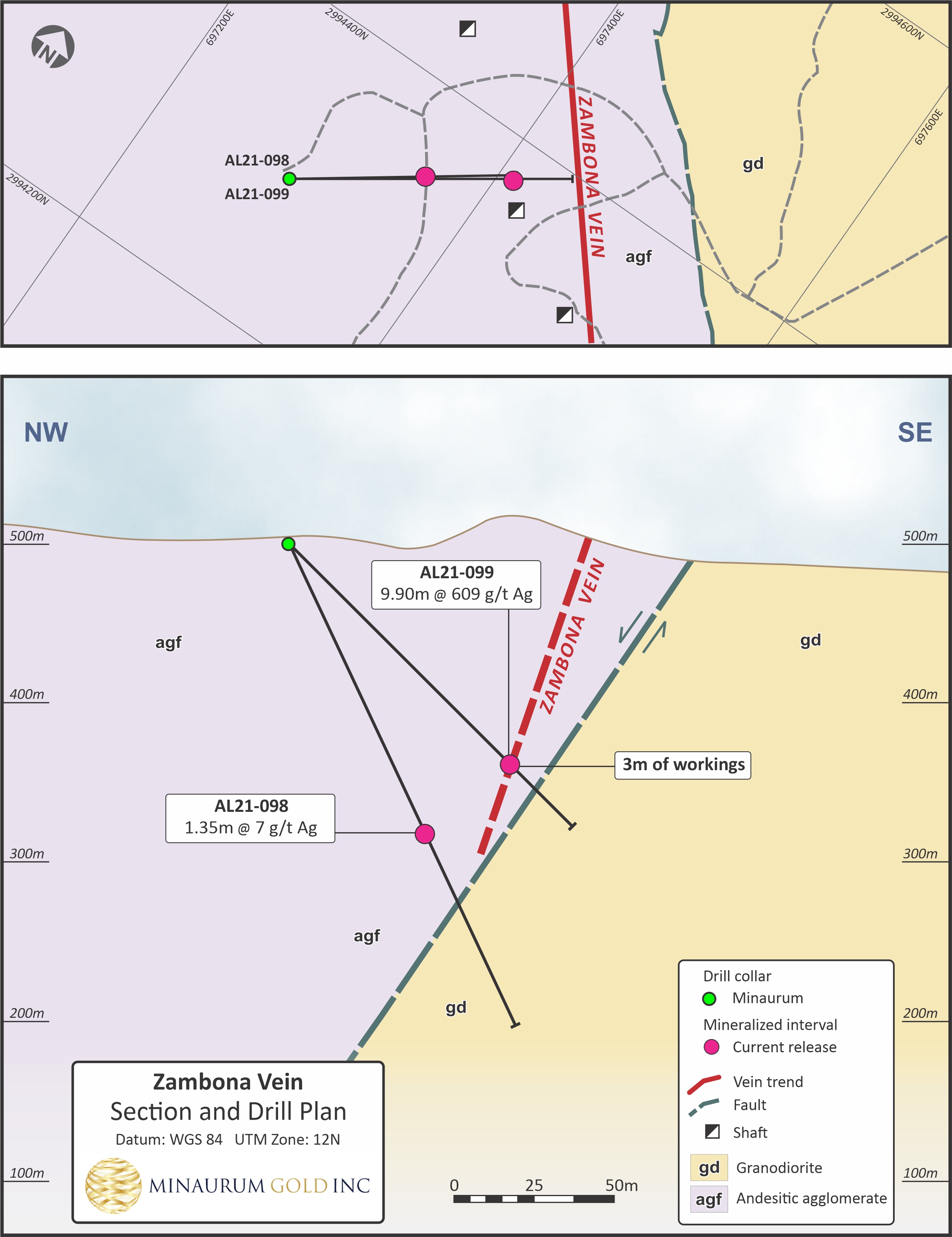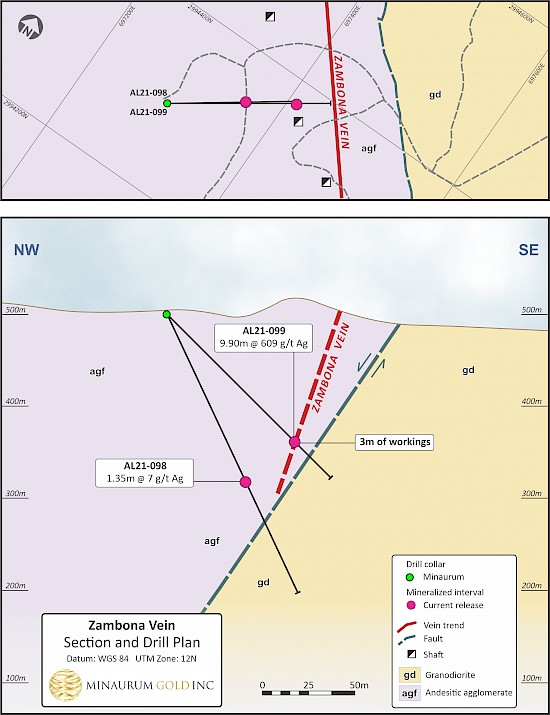 Minas Nuevas consists of a group of veins located in the NE of the Alamos concession block. In its northern-most section, the vein bends sharply to the northwest encompassing the Zambona vein, where historical records and reports indicate that mine workings followed a northwest-plunging silver shoot. Holes AL21-098 and -099 are the first ever holes to test the Zambona vein zone (Figures 2 and 3).