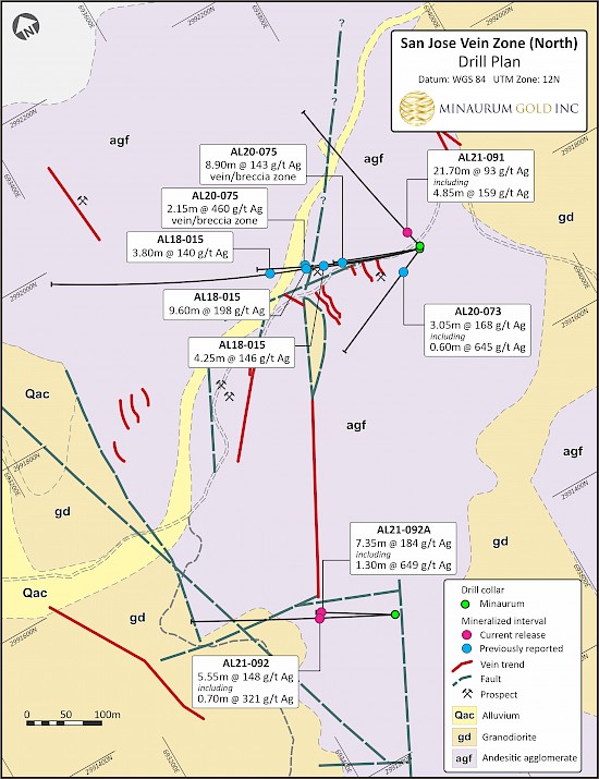- Hole AL21-091 returned 21.70 m @ 93 g/t Ag; including 4.85 m @ 159 g/t Ag