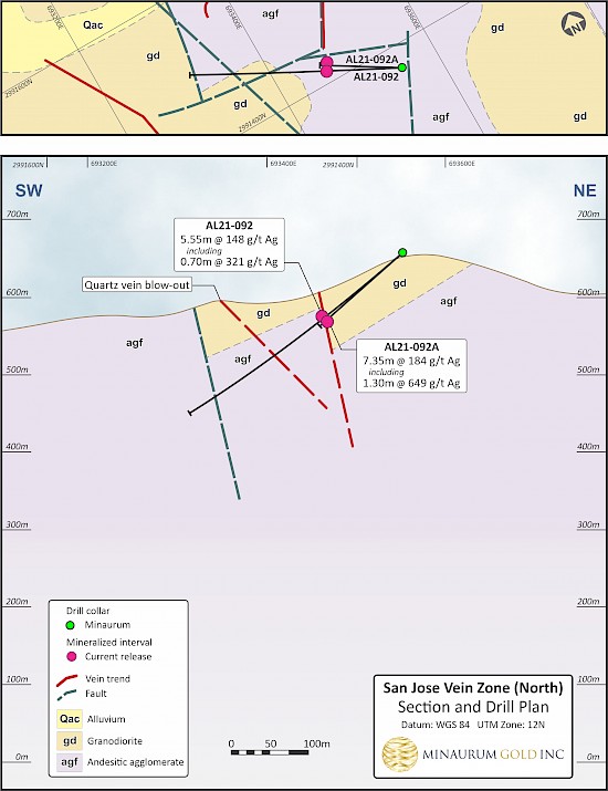 Figure 5. San Jose cross section showing holes AL21-092 and AL21-092A. Click image to enlarge.