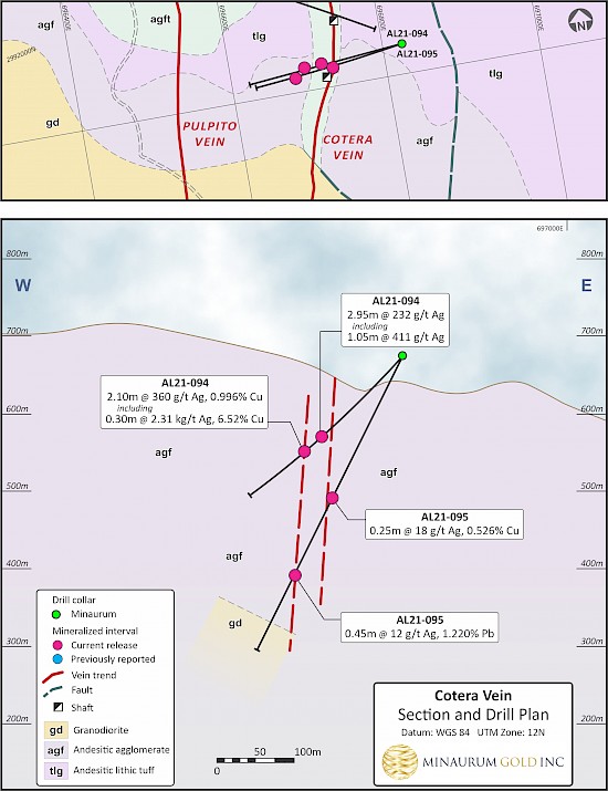 The north-south-striking, steeply dipping Cotera zone extends for a kilometre to the north and 300 m to the south of the drilled area. Holes AL21-094 and -095 cut the Cotera zone approximately 80 metres south of Hole AL19-035 intercept (Figures 6 and 7). AL21-094 intersected high-grade silver and copper of 0.30 m @ 2,310 g/t Ag and 6.52% Cu within an interval of 2.10 m @ 360 g/t Ag and 1.00% Cu and 2.95 m @ 232 g/t Ag, including 1.05 m @ 411 g/t. Hole AL21-095, drilled from the same pad as AL21-094, cut intervals of anomalous base metals and silver mineralization.