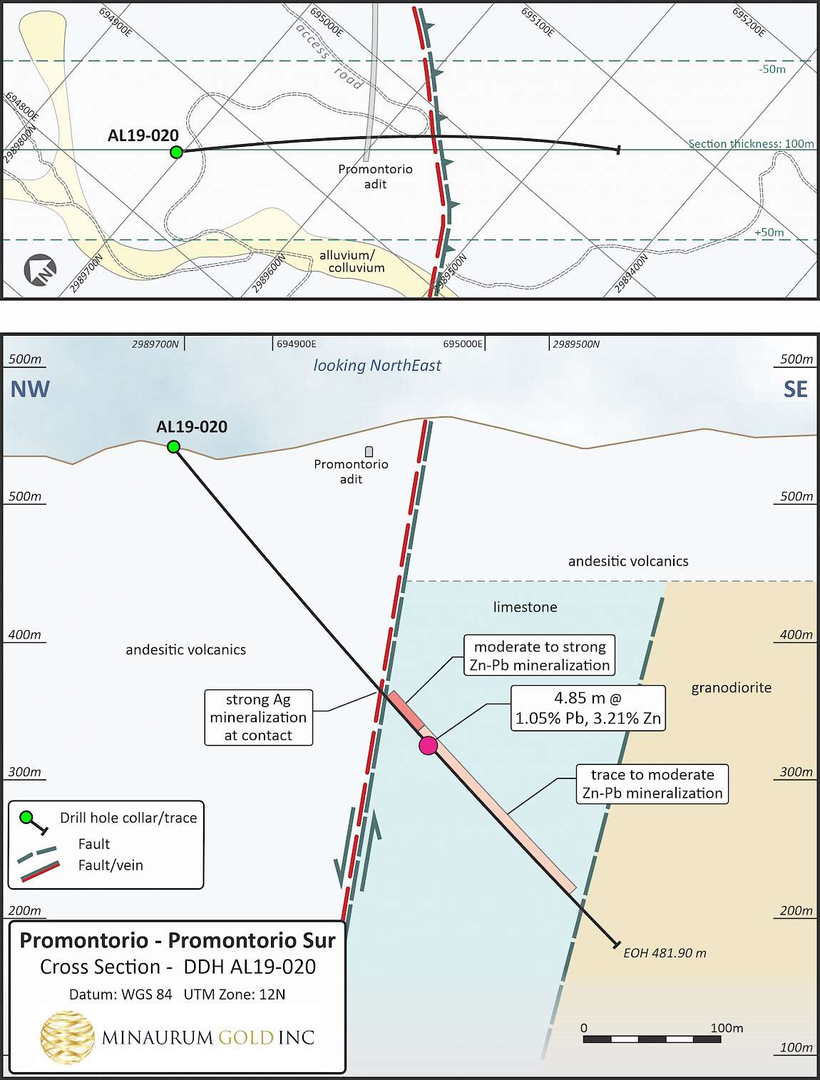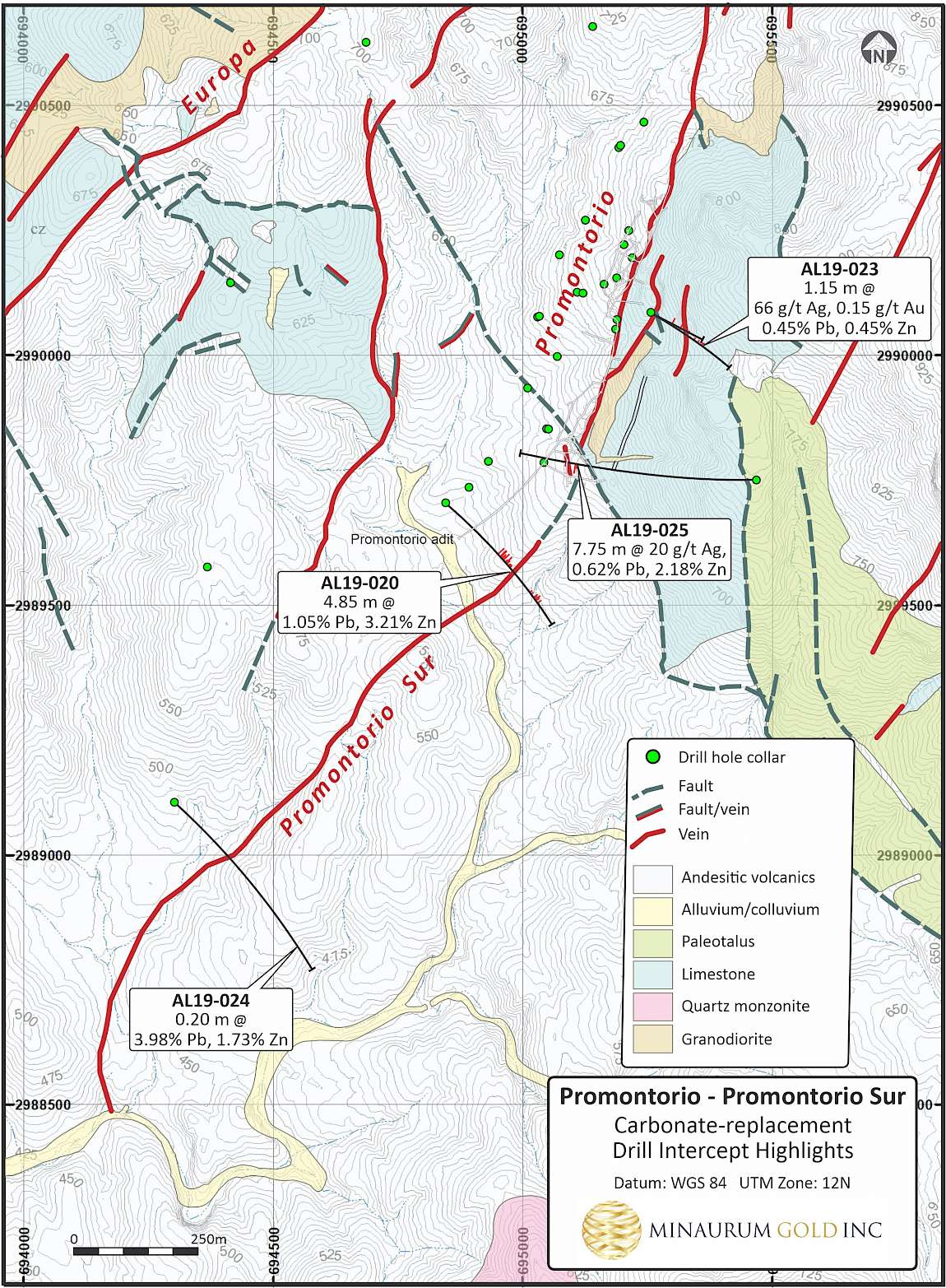 CRD mineralization cut so far at Alamos is characterized by zinc and lead sulfides that replace recrystallized limestone in the footwall of the Promontorio and Promontorio Sur vein zones (Figure 1). These veins are emplaced along and parallel to north-northeast faults that juxtapose andesitic agglomerate, recrystallized limestone, and granodiorite. Intersections of this footwall carbonate-replacement mineralization were reported along with vein mineralization in Minaurum Gold’s news release dated August 22, 2019 (Table 1), but not pursued due to the company’s focus on silver and gold.