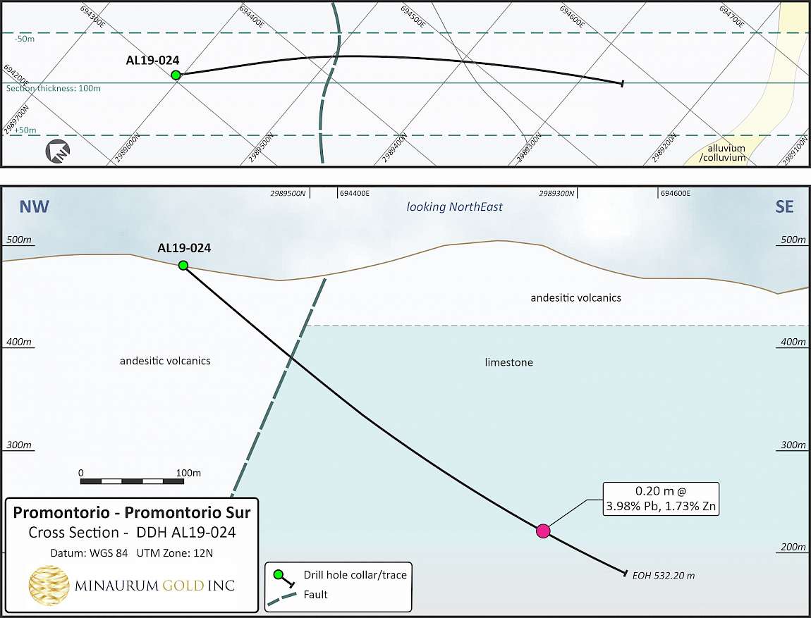 - Hole AL19-024 (800 m southwest of AL19-020): 1.73% Zn and 3.98% Pb over 0.20 m