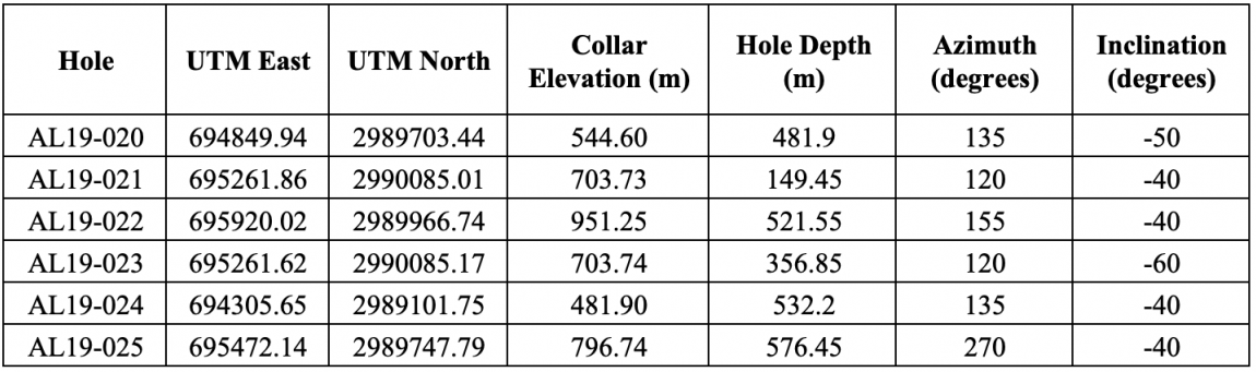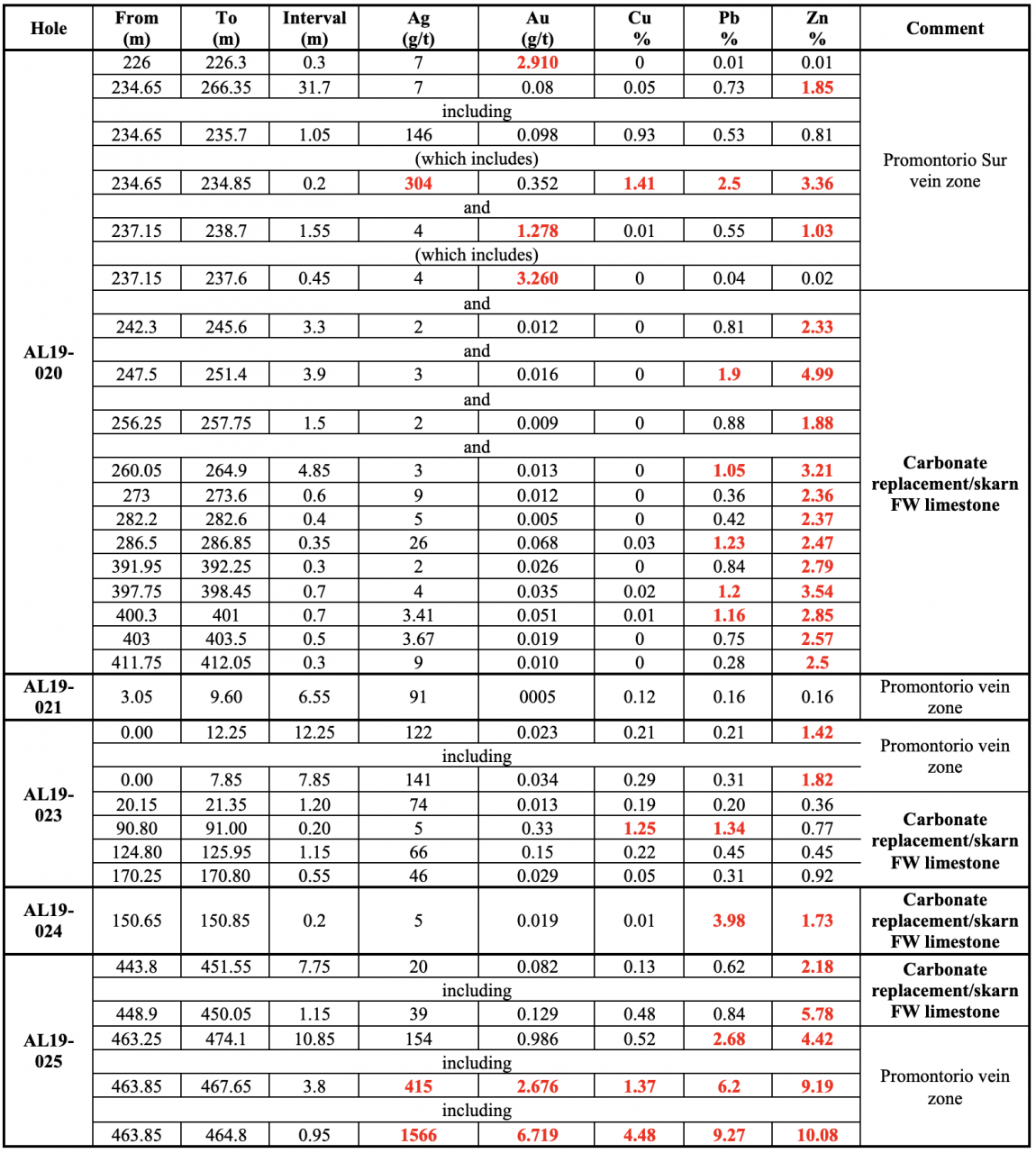 - Hole AL19-025 (250 m northeast of AL19-020): 2.18% Zn and 0.62% Pb over 7.75 m
