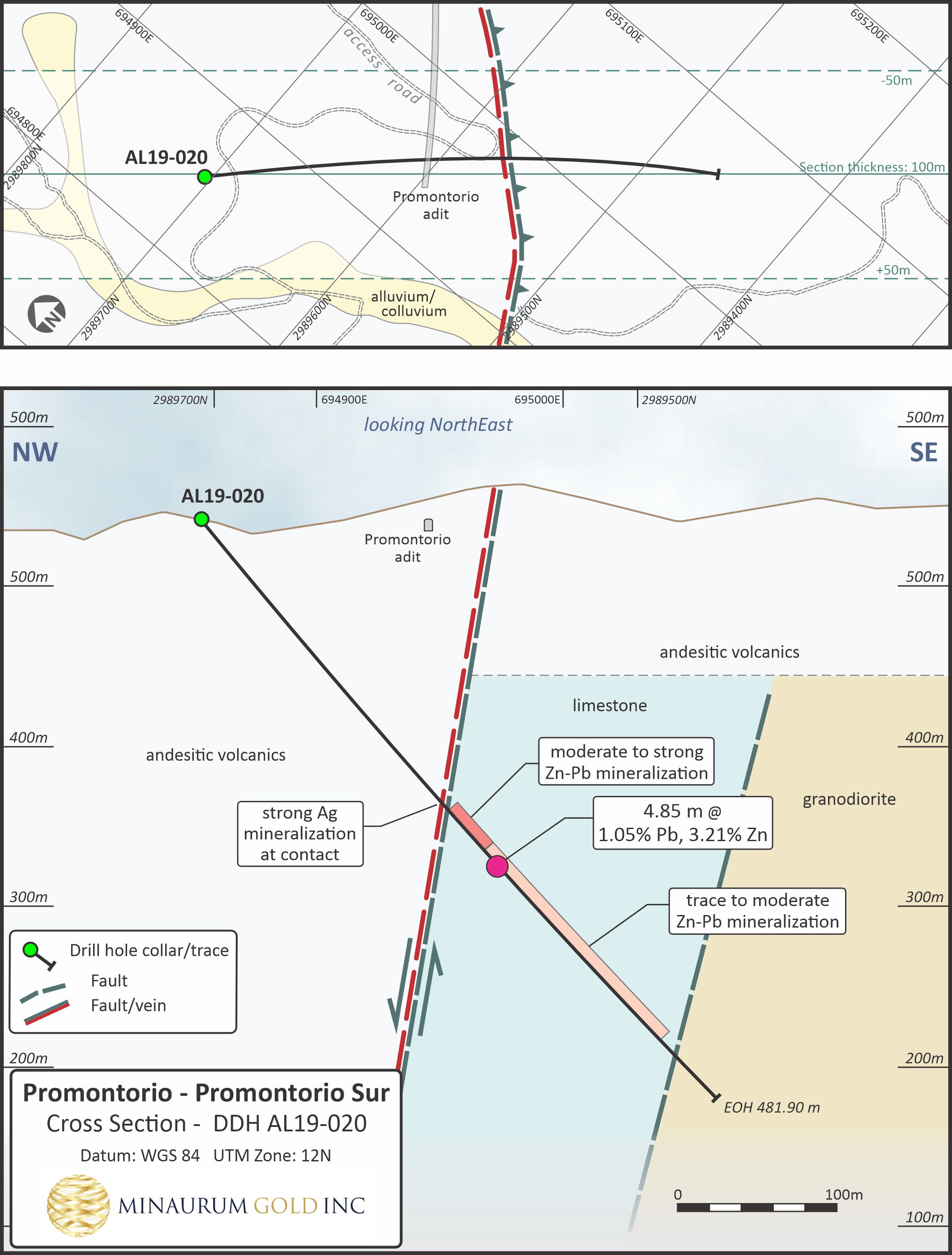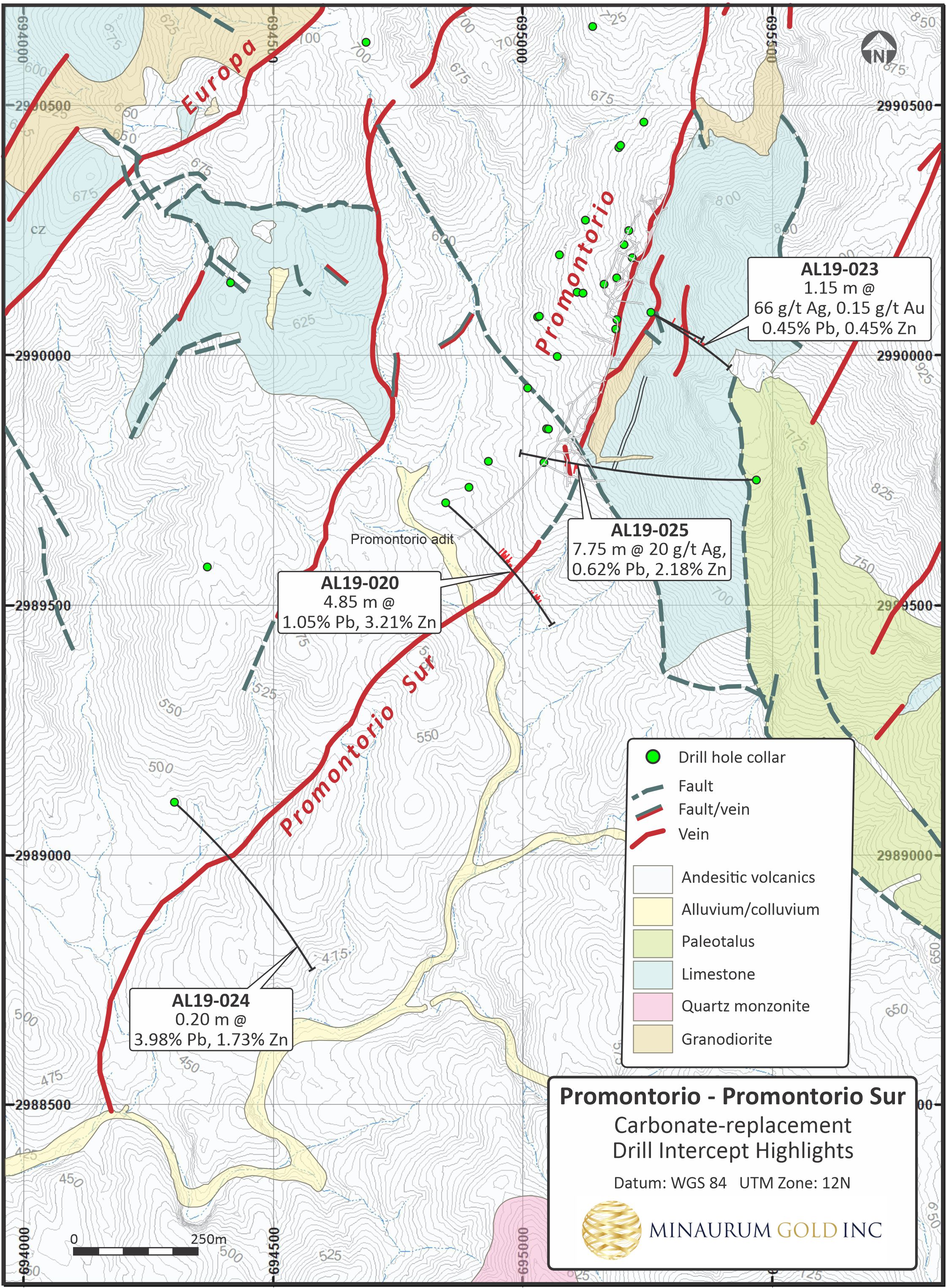CRD mineralization cut so far at Alamos is characterized by zinc and lead sulfides that replace recrystallized limestone in the footwall of the Promontorio and Promontorio Sur vein zones (Figure 1). These veins are emplaced along and parallel to north-northeast faults that juxtapose andesitic agglomerate, recrystallized limestone, and granodiorite. Intersections of this footwall carbonate-replacement mineralization were reported along with vein mineralization in Minaurum Gold’s news release dated August 22, 2019 (Table 1), but not pursued due to the company’s focus on silver and gold.