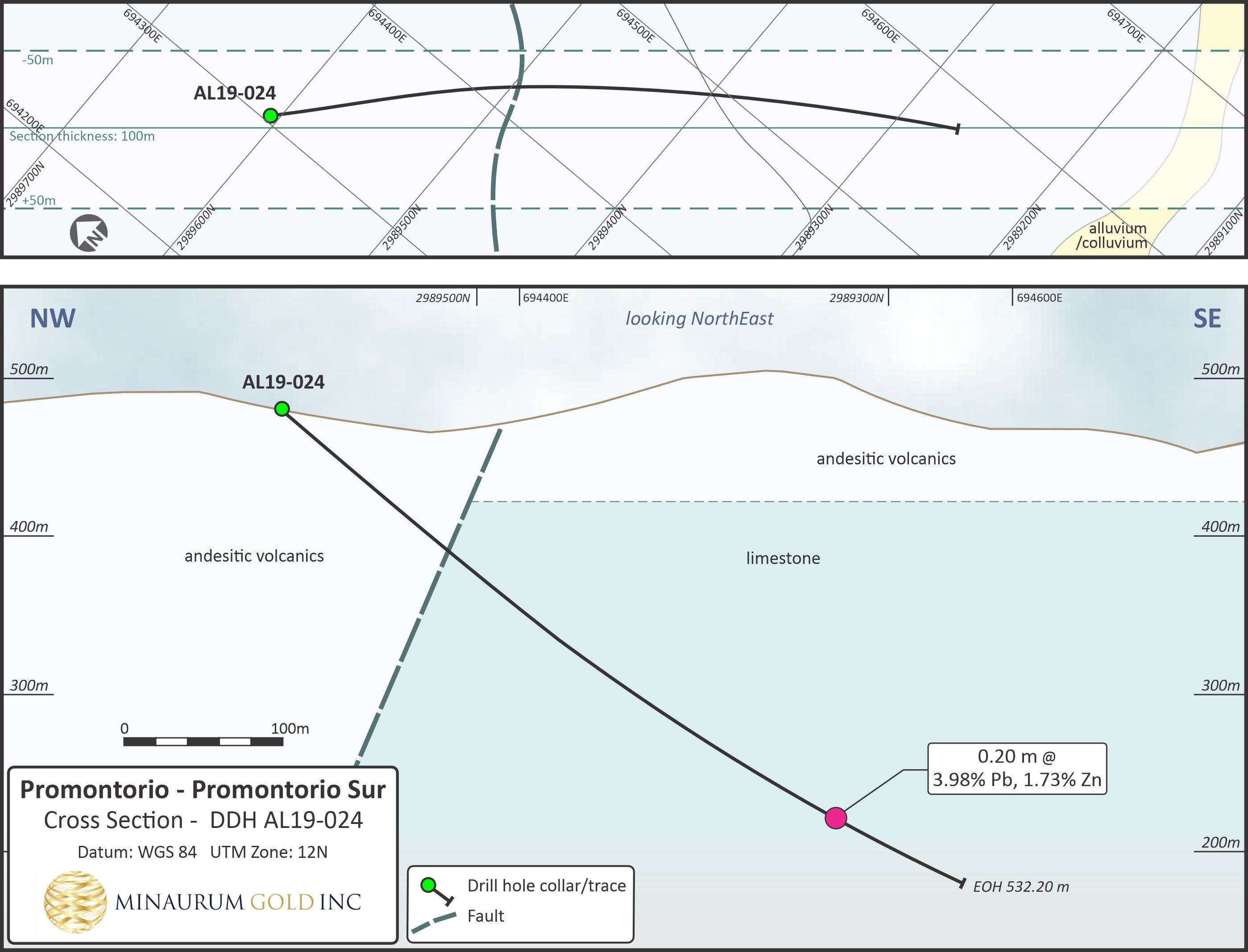 - Hole AL19-024 (800 m southwest of AL19-020): 1.73% Zn and 3.98% Pb over 0.20 m