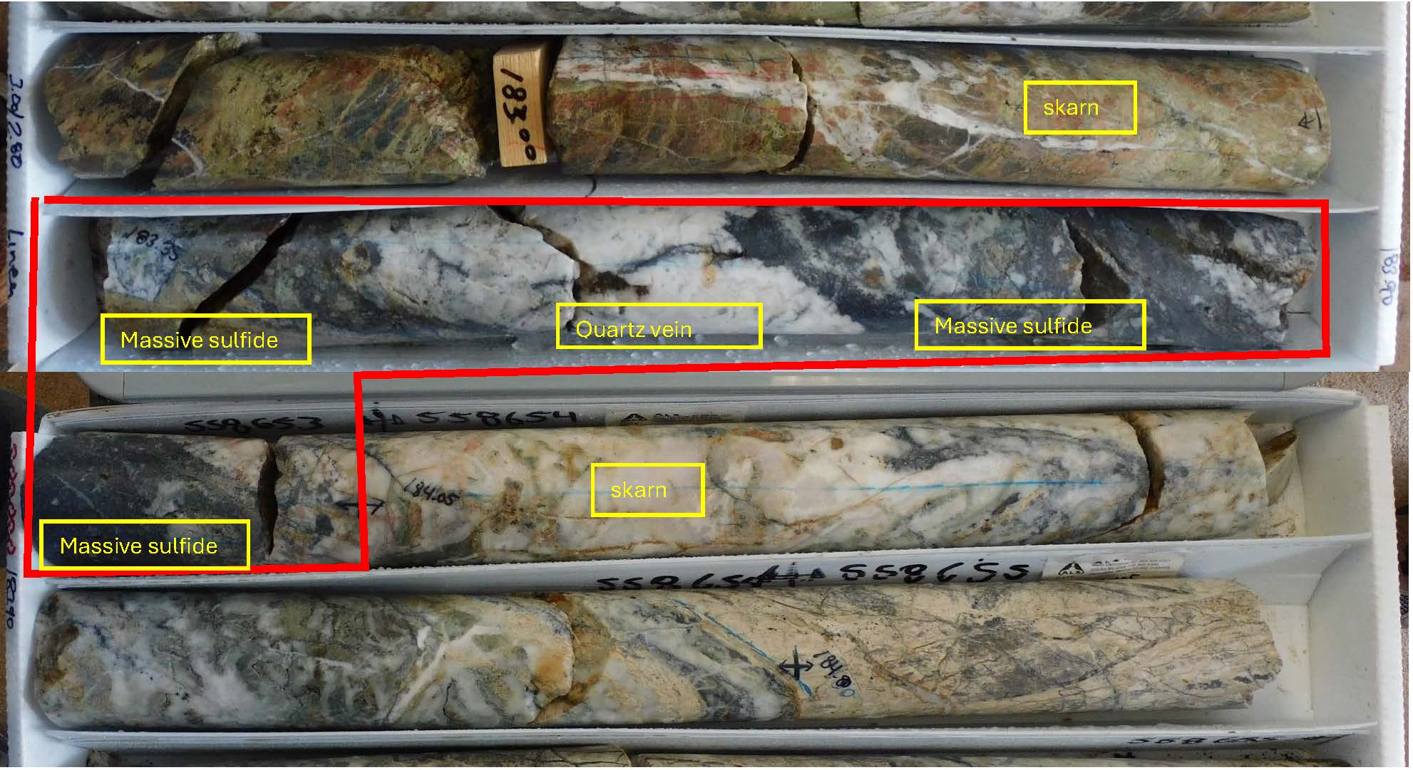 Figure 1. Drill core photo of Hole AL24-105: 182.80 m – 185.10 m, intersected 1.25 m of 309 g/t AgEq including 0.70-m interval (183.35 – 184.05 m) that assayed 2,976 g/t Ag Equivalent or 2,431 g/t Ag, 0.266 g/t Au, 1.29% Cu, 7.41% Pb, and 6.06% Zn. Host rock is skarn-altered limestone.