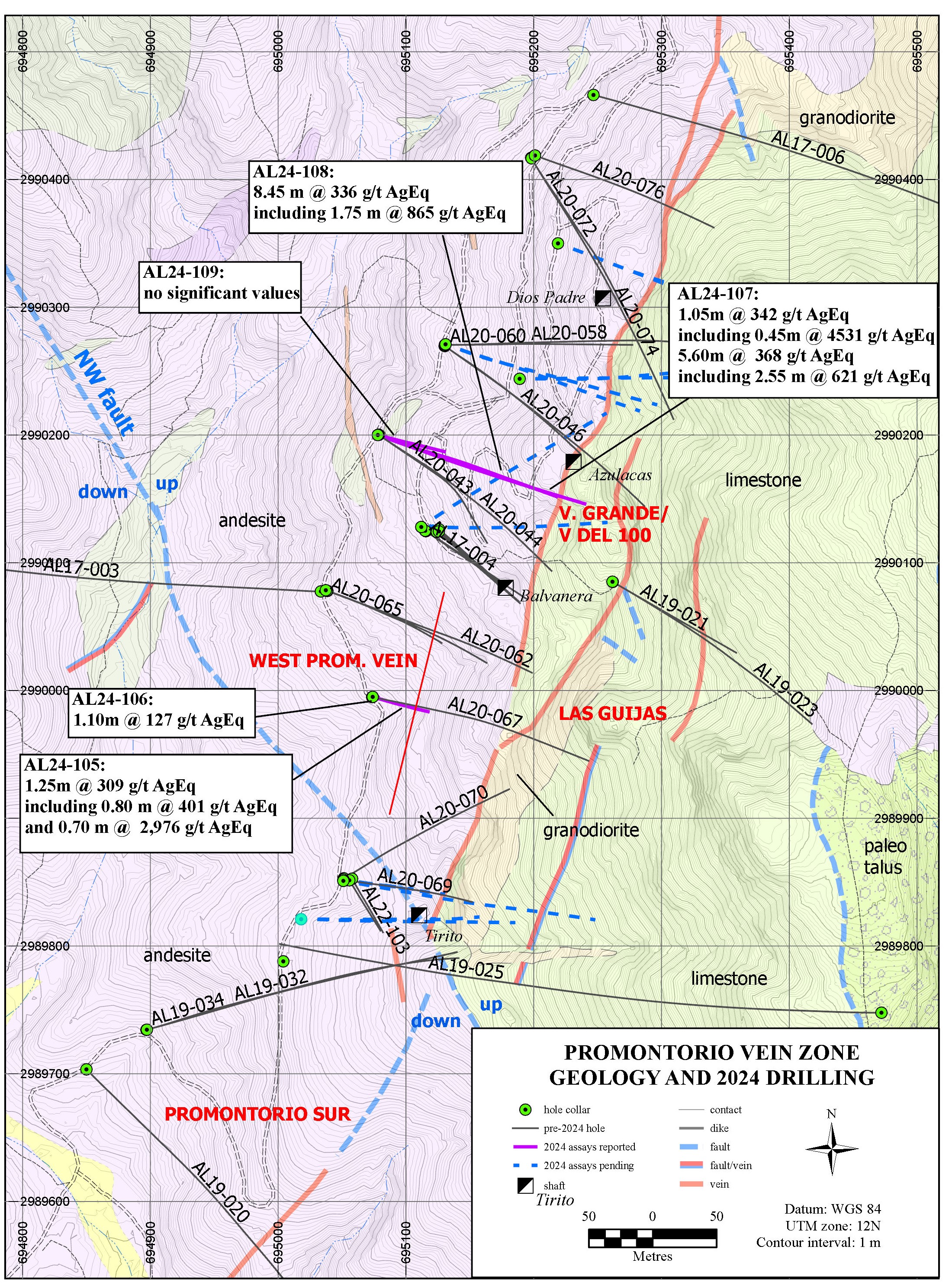 The first 5 holes totaled 1,286 m (Table 1, Figure 2) and were drilled on two fences across the Promontorio vein zone. Holes AL24-105 and AL24-106 tested the newly discovered West Promontorio vein on one fence, and holes AL24-107, -108, and -109 tested the Veta del 100/Veta Grande portion of the Promontorio zone on another fence.